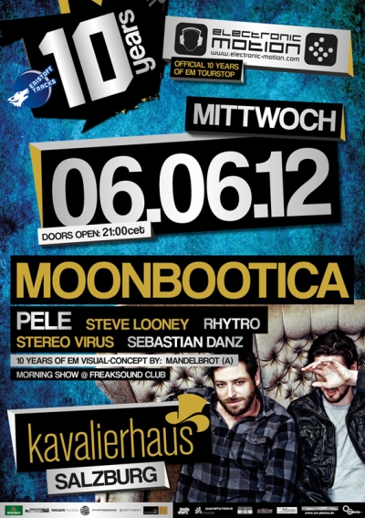 Eristoff Tracks presents: ★★★★★★★★★★★★★★★★★★★★★★★★★★★★★★★★★★★★★★★★★★★★★ █ 10 JAHRE ELECTRONIC MOTION ÖSTERREICH CLUB TOUR █ >> TOURSTOP HIGHLIGHT #4 @ KAVALIERHAUS __ Salzburg/Klessheim __ 2Areas MITTWOCH 06.06.2012 __ Start: 21uhr ██ ██ ██ ██ ██ ██ ██ ██ ██ ██ ██ ██ ██ ██ ██ ██ █ JUBILEE FLOOR █ "Our Disco Is Louder Than Yours" - ALBUM TOUR MOONBOOTICA (FOUR Music _ Cheap Thrills Rec. - Hamburg) www.moonbootica.com PELE (Cocoon Records – Get Physical – Echelon Open Air – München) www.pelemusic.de supported by: STEVE LOONEY __ RHYTRO (www.electronic-motion.com) ██ LIVE VISUALS CONCEPT BY: MANDELBROT (A) ██ ██ ██ ██ ██ ██ ██ ██ ██ ██ ██ ██ ██ ██ ██ ██ █ OPEN AIR LOUNGE: █ …Relax – Chill - Talk – N-Joy!!! > Minimalistic Atmosphere created by: STEREO VIRUS (www.electronic-motion.com) SEBASTIAN DANZ (www.sakog.net) ██ ██ ██ ██ ██ ██ ██ ██ ██ ██ ██ ██ ██ ██ ██ ██ VVK PRICE: 14€ @ Ö-TICKET & RAIKA @ HANDYBÖRSE Kiesel & Linzergasse SBG // KEINE GEBÜHREN!!! @ RIEGER FASHION - Europark // KEINE GEBÜHREN @ ONLINE TICKETS - www.electronic-motion.com VIP/INFO/PRESSE: bianca@electronic-motion.com NEU! > VIP TISCH RESERVIERUNGEN: bianca@electronic-motion.com CITY SHUTTLE SERVICE!!! Infos: express@electronic-motion.com _MORNING SHOW @ FREAKSOUND CLUB INFO CORNER: www.electronic-motion.com www.facebook.com/soundforce.edition www.kavalierhaus.at |