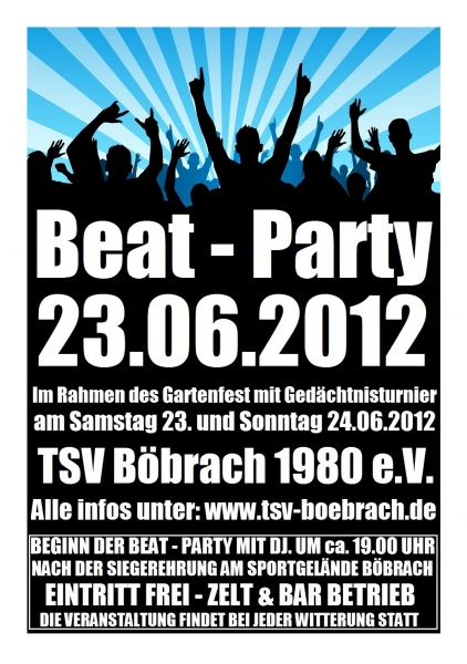| Samstag 23.06.2012 ab 19.00Uhr am Sportgelände - TSV Böbrach 1980 e. V. Beat - Party mit DJ. PARTY - TIME // Non Stop ... Eintritt Frei - Veranstaltung findet bei jeder Witterung statt - Bar und Zeltbetrieb ... www.tsv-boebrach.de im Rahmen des: Gartenfest des TSV Böbrach mit Kleinfeldturnier (5. Walter-Wühr-Gedächtnisturnier 2012 in Böbrach) am Samstag 23.06. - Sonntag 24.06.2012 |