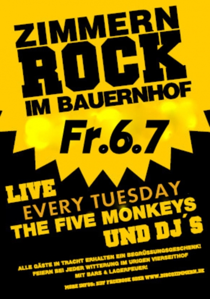 | Alle Gäste in Tracht erhalten ein Begrüßungsgeschenk! The Five Monkeys live Außerdem heizen euch diverse DJ´s ein Bei jeder Witterung! Bars und Lagerfeuer im urigen Vierseithof |