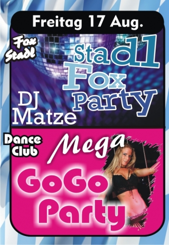 | Dance Club: Mega GoGo Party Stadl: Stadl Fox Party mit DJ Matze Terrasse: Gratis Grillen den ganzen Sommer! Soviel ihr wollt! Außerdem: Den ganzen August über Live Bands auf der Raucherterrasse! O´zapft und aufgspuid is! |