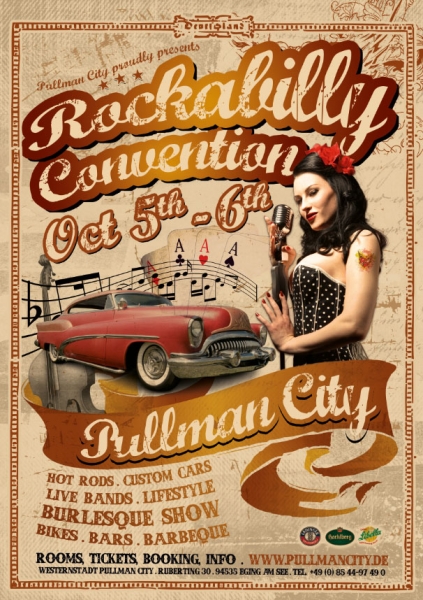 | 05.-06.10.2012 in der Westernstadt Pullman City Eging am See An diesem Wochenende wird es wieder lebendig – das Lebensgefühl der 50er Jahre mit dem passenden Lifestyle mit Frisuren, Make-Up, Outfits und heißen Schlitten wie Cadillac, Hotrod und Co. Burlesque Shows sorgen für frivole und sexy Unterhaltung. Und was darf natürlich auch nicht fehlen? Die passende Musik dazu! Rund 16 verschiedene Bands am Freitag und Samstag, live und echt – von sanft bis wild. Mit dabei sind die deutschen, international erfolgreichen Lennerockers, Urgesteine aus der Szene. Jean Vincent und Johnny Red, Sänger der "Jailbirds", aus Großbritannien überzeugen durch mehr als 20 Jahre Bühnenerfahrung. Ebenfalls auf der Bühne: "Danny and the Wonderbras" – Gewinner des 1. Rockabilly Rumble! Ein volles und abwechslungsreiches Programm sorgt für beste Stimmung! Genießen Sie außerdem mit Ihrem 2-Tagesticket auch die Westernstadt am Sonntag – der Eintritt dafür ist in ihrem Ticket enthalten. Also rein ins Auto, Scheibe runterkurbeln, ordentlich laut Rock 'n' Roll hören und ab nach Pullman City! |