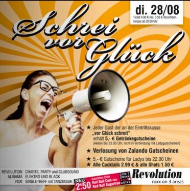 | ★ Jeder Gast der an der Eintrittskasse „vor Glück schreit“ erhält 5,- € Getränkegutscheine (Aktion bis 23.00 Uhr, nicht in Verbindung mit Ladygutscheinen) ★ Verlosung von Zalando Gutscheinen ★ 5,- € Gutscheine für Ladys bis 22.00 Uhr ★ Alle Cocktails 2.99 € & alle Shots 1.50 € |
