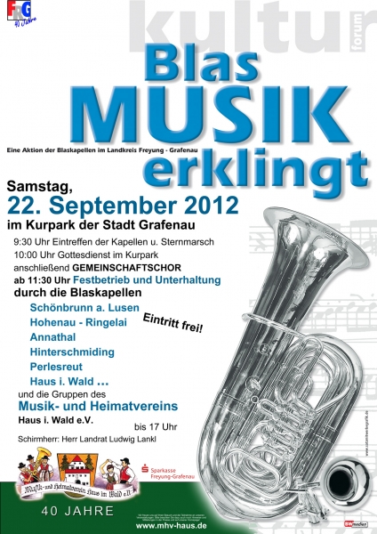 Wurde wegen schlechter Witterung abgesagt! Eine Aktion der Blaskapellen im Landkreis Freyung - Grafenau 9:30 Uhr Eintreffen der Kapellen u. Sternmarsch 10:00 Uhr Gottesdienst im Kurpark anschließend GEMEINSCHAFTSCHOR ab 11:30 Uhr Festbetrieb und Unterhaltung durch die Blaskapellen > Schönbrunn a. Lusen > Hohenau - Ringelai > Annathal > Hinterschmiding > Perlesreut > Haus i. Wald ... und die Gruppen des Musik- und Heimatvereins Haus i. Wald e.V. Schirmherr: Herr Landrat Ludwig Lankl |