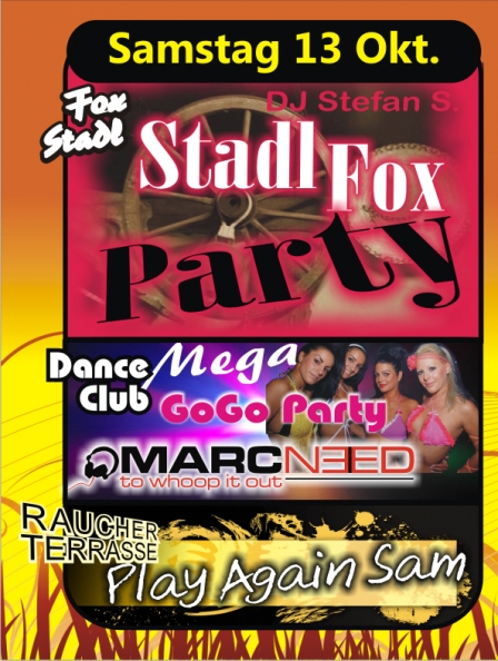 | Dance Club: Mega GoGo Party Marc need to whoop it out Stadl: Stadl Fox Party Raucherterrasse: Play again Sam 1 Tonne Leberkäse im Oktober for free! |