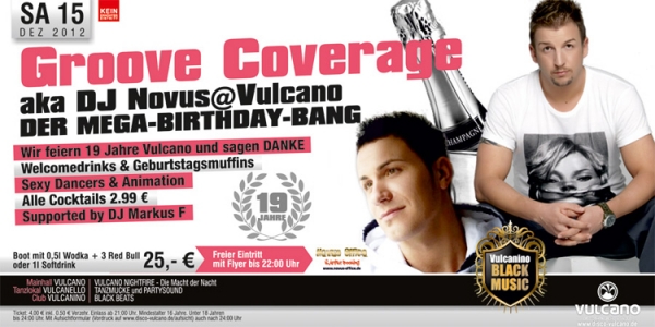 | DER MEGA-BIRTHDAY-BANG. Wir feiern 19 Jahre Vulcano und sagen DANKE. Welcomedrinks & Geburtstagsmuffins. Sexy Dancers & Animation. Alle Cocktails 2.99 €. Supported by DJ Markus F. Boot mit 0,5l Wodka + 3 Red Bull oder 1l Softdrink 25,- €. Freier Eintritt mit Flyer bis 22:00 Uhr. |
