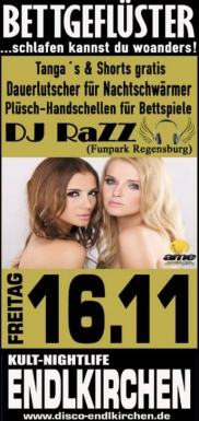 | AME Events präsentiert BETTGEFLÜSTER in der Discothek Endlkirchen. Diese Party ist nichs für Langschläfer.... An diesem Abend versorgt euch DJ RaZZ (Funpark Regensburg) mit dem besten Partysound der Stadt. Zudem verschenken wir für die gewissen Bettspiele folgende Spielzeuge: KOMM DU + 6 FREUNDE IM "SEXY" SCHLAFOUTFIT UND WIR SCHENKEN EUCH EINEN 30 EURO PARTYGUTSCHEIN (meldet euch komplett an der Kasse) - Dauerlutscher für Nachtschwärmer - Sexy Tanga´s & Shorts - Plüschhandschellen für den gewissen Kick - uvm. ...schlafen kannst du wo anders...we make this Party tonight! |