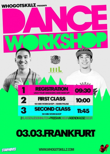 | WHOGOTSKILLZ HIP HOP DANCE WORKSHOP TOUR 2013 WITH VINH NGUYEN AND JAWN HA Frankfurt, zieht Eure Sneaker an - WhoGotSkillz präsentiert Euch am 3. März die erste WhoGotSkillz Workshop Tour im neuen Jahr 2013. Es erwarten Euch absolute Top-Choreographen: Dieses Mal konnten keine Geringeren als der Movement Lifestyle Angehörige Vinh Nguyen und das Most Wanted Crew Mitglied Jawn Ha für einen rund 3-stündigen Workshop gewonnen werden. Die beiden Ausnahmetalente statten Frankfurt mit Ihrer HIP HOP DANCE WORKSHOP TOUR einen Besuch ab, um Tanzbegeisterte jeden Alters mit ihren einzigartigen Moves zu begeistern – auch Ihr könnt einer der glücklichen Teilnehmer sein! Sichert euch jetzt Euren Platz und nutzt die sagenhafte Chance, Jawn und Vinh hautnah zu erleben! Schnell anmelden auf whogotskillz.com FRANKFURT (GERMANY) WANN: 03.03.2012, Beginn: 9.30 Uhr WO: Body Life, Friesstraße 3, 60388 Frankfurt Weitere Tourdates: 24.02. MARBURG 26.02. ARNHEM (NETHERLAND) 27.02. ARNHEM (NETHERLAND) 01.03. SAARBRÜCKEN 02.03. MÜNCHEN 02.03. STUTTGART 03.03. KÖLN 04.03. MAINZ 05.03. HARLOW (UK) 08.03. BREGENZ (AUSTRIA) 09.03. ZÜRICH (SWITZERLAND) |