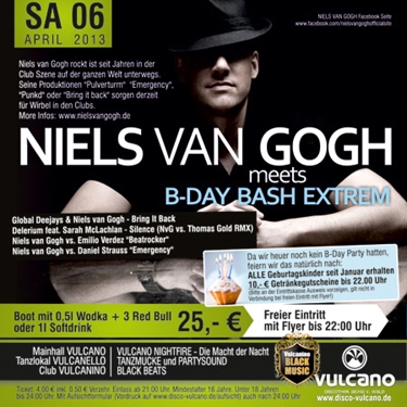 | Niels van Gogh rockt ist seit Jahren in der Club Szene auf der ganzen Welt unterwegs. Seine Produktionen 'Pulverturm', 'Emergency', 'Punkd' oder 'Bring it back' sorgen derzeit für Wirbel in den Clubs. More Infos: www.nielsvangogh.de Global Deejays & Niels van Gogh - Bring It Back Delerium feat. Sarah McLachlan - Silence (NvG vs. Thomas Gold RMX), Niels van Gogh vs. Emilio Verdez 'Beatrocker', Niels van Gogh vs. Daniel Strauss 'Emergency'. Da wir heuer noch kein B-Day Party hatten, feiern wir das natürlich nach: ALLE Geburtagskinder seit Januar erhalten 10,- € Getränkegutscheine bis 22.00 Uhr (Bitte an der Eintrittskasse Ausweis vorzeigen, gilt nicht in Verbindung bei freien Eintritt mit Flyer!) |