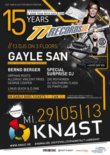| 15 Jahre 77records Friendship Festival & Xone Tour with Gayle San ! - Seit 1998 alles für den guten Ton - Floors: 3 // DJ`s: 13 Djs - Line Up: GAYLE SAN, Bernd Berger, Special Surprise DJ, Linus Quick, D.One, Allergic, Vincent Fries, George Cooper, die Rothoren, Dj Southern Flash, DG Pimpflow... Eintritt Abendkasse: 12.- // Early Bird Ticket (nur im Vorverkauf): 9.- // + SPECIAL: JEDER ZAHLENDE GAST ERHÄLT EINEN 10.- EINKAUFSGUTSCHEIN für www.77records.de !! Mehr Infos findest du HIER. |