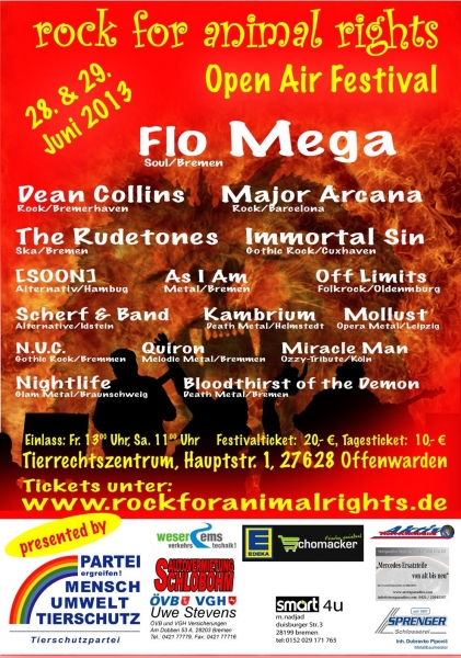 | Öffnungszeiten: Freitag: 8:00 - 16:00 Uhr Samstag: 8:00 - 16:00 Uhr Eintrittspreise: Festivalticket: 0 Camping: 0 Tagesticket: 0 Am 28. und 29,06.2013 ist es Wieder soweit. Das zweite „rock for animal rights“ Open Air Festival zugunsten des Tierrechtsbund Aktiv e.V. findet statt. Von Soul über Reggae, Rock bis zu Heavy Metal bietet das Festival für jeden Geschmack etwas. 18 Bands rocken für den guten Zweck. Der Erlös des Festivals kommt dem Ausbau des Tierrechtszentrums in Sandstedt-Offenwarden zu Gute, wo es auch stattfindet. Das Tierrechtszentrum soll eine Geburtsstätte neuer Ideen im Bereich Tierrecht und Umweltschutz werden, ein Art Thinktank, wo verschiedene Organisationen neue Konzepte und Kampagnen entwickeln. Wer will kann reichlich Infos zum Tier- und Umweltschutz bekommen. Selbstverständlich wird auch für das leibliche Wohl gesorgt. Für einen den in der heutigen Zeit unglaublichen Eintrittspreis von 10,- €/Tag, bzw. 20,- € für das Festivalticket könnt ihr dabei sein. Ein großer Zeltplatz sowie ausreichend Parkplätze befinden sich gleich neben dem Festivalgelände. Doors Open ist am Freitag um 13:00 Uhr und um 15:00 Uhr startet die erste Band. Samstag geht es jeweils zwei Stunden früher los. Weitere Infos gibt es auf der Seite: www.rockforanimalrights.de Bisher sind folgende Acts bestätigt: Flo Mega & The Ruffcats (Soul/Bremen) FLO MEGA; seit seinem Überraschungs-Vize-Sieg beim Raab‘schen Bundesvision Song Contest 2011 hat sich der Bremer Souler mit dem leicht rotzigen Klang in der Stimme und dem sympathischen Tanzstil deutschlandweit ins Gespräch gebracht. Sein im Herbst veröffentlichtes Debütalbum „Die wirklich wahren Dinge“ (Four Music/Homeground Rec.) zeugt nicht nur in der Tonträgervariante davon, wie aufregend und angenehm Soul auf Deutsch kribbeln kann. Wer FLO MEGA & THE RUFFCATS bereits in Aktion erleben durfte, weiß um die musikalische Exklusivität dieses wunderbaren und verrückten Live-Spektakels. Zu seinen wohl bekanntesten Fans zählen z.B. Stefan Raab, Ina Müller, Gentleman oder Tim Mälzer (um nur einige zu nennen). FLO MEGA ist ein exzellenter Entertainer, ein begnadeter Performer – einer, der sein Publikum um den Finger wickelt, zum Lachen bringt und dabei ganz tief innen berührt. Mit viel Seele auf der Zunge und ausgestattet mit einem außergewöhnlichen Gespür für Texte und Töne verknüpft er seine fließende Lyrik mit dem stilsicheren Sound seiner Backing-Band THE RUFFCATS. Major Arcana (Rock/Barcelona) Major Arcana ist eine “Tierrechts-Band”, die im Jahre 2000 auf den kanarischen Inseln entstand und heute in Barcelona zu Hause ist. Die Hauptmitglieder sind Sharon Townsend (Gesang) aus dem Vereinigten Königreich und Antonio Calero (Gitarre) von den kanarischen Inseln. Zu den musikalischen Einflüssen zählen unter anderem Hendrix, Joplin, Red Hot Chili Peppers, The White Stripes – um nur einige zu nennen. Das Hauptziel der Band ist es, über das Leiden der Tiere aufzuklären, die vegane Lebensweise zu vermitteln und durch aktives Wirken und direkte Aktionen einen Unterschied zu bewirken. Die hauptsächliche Inspiration dazu liefert „ALF“ – die Animal Liberation Front. Ein Video der Band beinhaltet einen Anti-Stierkampf-Song (La Tortura No Es Kultura („die Folter ist keine Kultur“ – für alle Nichtfranzosen)), in dem einige Wortführer wichtiger Animal-Rights-Organisationen erscheinen, wie z.B. „Igualdadanimal“, „Libera“, „Animanaturales“, „Equanima“ und „Pacma“. Mit drei bereits erschienenen- und einem bald veröffentlichten Album ist die Nachricht stets dieselbe: Tiere sollen gleichermaßen wie wir Menschen ein Anrecht auf ihr Leben haben!!! Miracle Man (Ozzy Tribute/Köln) The band was officially started in November 2011. The founding members are Ace Kincaid and Max Valentino. Ace and Max are members of the Hard Rock band Pink Slip Cologne. The idea of starting the band came about around 2009. Ace and Max wanted to put together another project so they would be able to play more gigs. The idea to do Ozzy came about due to the fact that here in Germany there is only one other Ozzy tribute and the fact that we love Ozzy. Ace and Max began the process of looking for the right drummer and bass player in February of 2011. In October of 2011, we found our drummer. We found him in the person of Joe 'Castillo' who had just joined Pink Slip. It was perfect for us that Pink Slip's newest member was also interested in doing Ozzy. In November we found our bassist, Jens 'Daisley'. Jens brought that last element of professionalism that we were looking for. As of November 2011, our lineup is as follows: Ace Osbourne - Vocals Max E. Lee - Guitars Joe Castillo - Drums Jens Daisley - Bass …… Let the Madness Begin …… Scherf & Band (Alternative/Idstein) "...der Scherf ist am Start! Scherf & Band sind da!" Daniel Scherf gehört gewiss zu den Künstlern, denen das Herz auf der Zunge gewachsen ist. Er schreibt was er denkt, wie er sich fühlt und das mit vollem Herzblut. „Ich möchte gar nicht viel über mich erzählen und lasse lieber die Musik für mich sprechen. Musik ist für mich eine Art Lebenselixier! Freiheit und Ventil!“ 2010 startete er zunächst alleine die musikalische Herausforderung. Nach kurzer Zeit kamen 3 weitere Musiker dazu. Aus „Scherf“ wurde „Scherf & Band“. Seitdem macht die Band deutschen Alternativrock und bespielt die Bühnen des Landes. Bei "Scherf & Band" gibt es mal krachende und grungige Gitarren, mal ruhige akustische Klänge und Drums, die Wut und Enttäuschung, aber auch die Hoffnung in großartig ausgearbeiteten Lyrics beschreiben. Die CD „Am Start – EP“ wurde Anfang 2012 in Frankfurt am Main aufgenommen und am 08.03.2013 veröffentlicht. N.U.C. (Gothic Rock/Bremen) Der Gothic-Rock von N.U.C. liegt irgendwo im Dreieck zwischen Lacrimosa, The Sisters Of Mercy und Oomph!. Ihr eigenständiger Rock-Sound wird unterstützt vom 80er-Jahre typisc