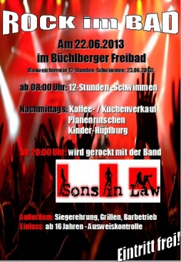 | Rock im Bad – die legendärste Party des Sommers!!! Also seid dabei und freut euch auf eine lange Nacht in der zusammen mit der Band Sons in Law kräftig gerockt werden darf Wo?: Büchlberger Freibad Beginn der Party?: ab 20:00 Uhr Für das leibliche Wohl ist bestens gesorgt mit - Pilsinsel - Barbetrieb - Und Grillen Der EINTRITT ist FREI Einlass: ab 16 Jahren – Ausweiskontrolle Besucht uns auch auf: Facebook Rock im Bad Veranstaltung |