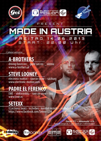 GEI Musikclub, Eristoff Tracks & Electronic Motion present: MADE IN AUSTRIA - Delecious electronic music homemade! FREITAG 14.06.2013 Start: 22:00 Uhr Eintritt: € 5,- < Mitternacht > € 8,- Please welcome: ★★★A-BROTHERS★★★ driving forces rec _ gayle san rec. _ vienna www.a-brothers.at ★★★STEVE LOONEY★★★ electronic motion – rave on snow – salzburg www.electronic-motion.com ★★★PADRE EL FERENCO★★★ EME – elektronikka – rave on snow – linz www.eme.ec ★★★SETEXX★★★ ILLectronic beatz - techvibes - kombat records – vöcklabruck https://www.facebook.com/Setexx1234 |