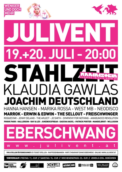 | JULIVENT EBERSCHWANG 19. + 20. JULI 2013 weniger und doch mehr ▬▬▬▬▬▬▬▬▬▬▬▬▬▬▬▬▬▬▬▬▬▬▬▬▬▬▬▬▬▬▬▬▬▬ ⇉ 3 STAGES ⇉ MEHR ALS 20 ACTS ⇉ INTER- UND NATIONALES LINEUP an den gitarren / bands ▬▬▬▬▬▬▬▬▬▬▬▬▬▬▬▬▬▬▬▬▬▬▬▬▬▬▬▬▬▬▬▬▬▬ ⇉ STAHLZEIT rammstein ⇉ JOACHIM DEUTSCHLAND ⇉ NEODISCO ⇉ MARROK ⇉ THE SELLOUT ⇉ ERWIN & EDWIN ⇉ FREISCHWINGER ⇉ SYMPATHY FOR NOTHING ⇉ SUPERVISION ⇉ THE ARLECT ⇉ PIKNIK PARK linkin park an den reglern / djanes / deejays ▬▬▬▬▬▬▬▬▬▬▬▬▬▬▬▬▬▬▬▬▬▬▬▬▬▬▬▬▬▬▬▬▬▬ ⇉ KLAUDIA GAWLAS ⇉ HANNA HANSEN ⇉ MARIKA ROSSA ⇉ WESTMB ⇉ ROQUESTAR ⇉ JENNY DELANO ⇉ JD SMITH ⇉ HALLERSON ⇉ RAY & LEX ⇉ JUKEBOXXFREAK ⇉ SASCHA HACKL ⇉ PATRICK PORTER an den optiken / visualisten ▬▬▬▬▬▬▬▬▬▬▬▬▬▬▬▬▬▬▬▬▬▬▬▬▬▬▬▬▬▬▬▬▬▬ ⇉ MANDELBROT ⇉ WILLUSION ticketpreise ▬▬▬▬▬▬▬▬▬▬▬▬▬▬▬▬▬▬▬▬▬▬▬▬▬▬▬▬▬▬▬▬▬▬ ⇉ Freitag ⇉ € 11,- [zzgl. Gebühren] ⇉ Samstag ⇉ € 15,- [zzgl. Gebühren] ⇉ Wochenendpass ⇉ € 23,- [zzgl. Gebühren] restkarten österreichweit erhältlich bei ▬▬▬▬▬▬▬▬▬▬▬▬▬▬▬▬▬▬▬▬▬▬▬▬▬▬▬▬▬▬▬▬▬▬ ⇉ allen Ö-TICKET Stellen & Libro, Saturn, Mediamarkt ⇉ allen RAIFFEISENBANKEN [Ermäßigung für Raika-Club Mitglieder] ⇉ beim WIRT Z\'MOARHOF [ohne Gebühren] ⇉ online tickets: www.julivent.at oder www.facebook.at/julivent genres ▬▬▬▬▬▬▬▬▬▬▬▬▬▬▬▬▬▬▬▬▬▬▬▬▬▬▬▬▬▬▬▬▬▬ ⇉ ROCK / INDUSTRIAL METAL / PUNKROCK ⇉ MUNDARTROCK / SKA / POP / ALTERNATIVE ⇉ HIP HOP ELECTRO RAP / DUBSTEP / DRUM AND BASS ⇉ TECHNO / ELECTRO / ELECTRONIC / TECH HOUSE ⇉ LUST / PARTY / HOUSE / CHARTS mehr Infos unter: www.julivent.at ▬▬▬▬▬▬▬▬▬▬▬▬▬▬▬▬▬▬▬▬▬▬▬▬▬▬▬▬▬▬▬▬▬▬ |