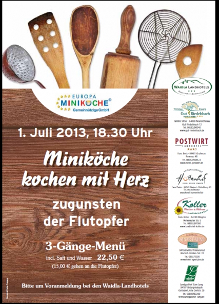 | 01.07.2013 Miniköche kochen mit Herz zugunsten der Flutopfer 3-Gänge-Menü inkl. Saft und Wasser: 22,50€ (15€ gehen an die Flutopfer) Bitte vorab Anmelden! |