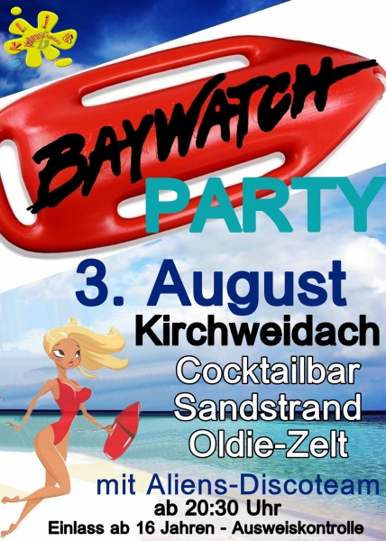 | Auch dieses Jahr gibt es die legendäre Baywatch-Party wieder! Mit: Cocktailbar Sandstrand Oldie-Zelt und dem Aliens-Discoteam! Einlass ab 16 Jahren - Ausweiskontrolle |