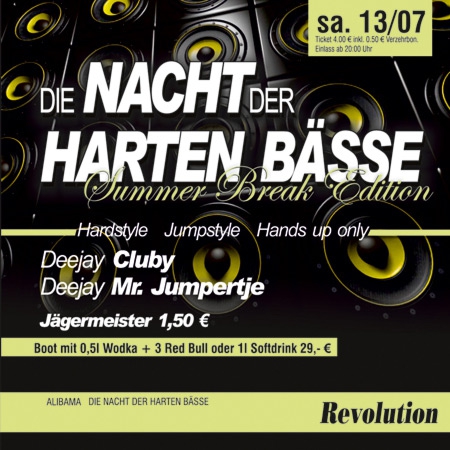 | DIE NACHT DER HARTEN BÄSSE Hardstyle - Jumpstyle - Hands up only. Deejay Cluby. Deejay Mr. Jumpertje. Jägermeister 1,50 €. Boot mit 0,5l Wodka + 3 Red Bull oder 1l Softdrink 29,- € |