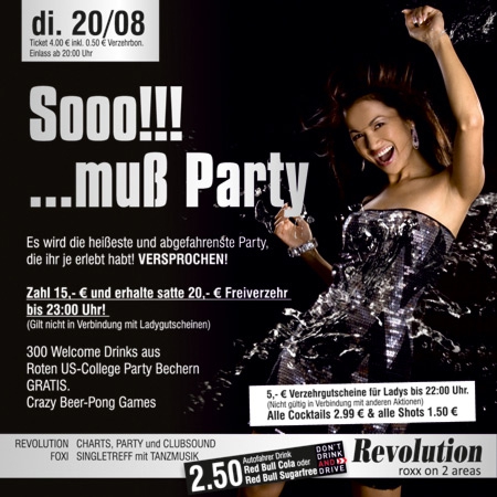 | SOOOOO! MUSS PARTY Es wird die heißeste und abgefahrenste Party, die ihr je erlebt habt! VERSPROCHEN! Zahl 15,- € und erhalte satte 20,- € Freiverzehr bis 23:00 Uhr! (Gilt nicht in Verbindung mit Ladygutscheinen). 300 Welcome Drinks aus Roten US-College Party Bechern. GRATIS. Crazy Beer-Pong Games |