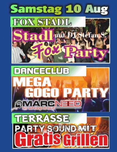 | Mega GoGo Party - Dance Club Marc Need to whoop it out! Fox Stadl - Stadl Fox Party mit DJ Stefan S. Terrasse - Party Sound mit Gratis Grillen Einlass ab 18 Jahren. Eintritt 5,- €. Geöffnet jeden Freitag und Samstag sowie vor Feiertagen ab 21:00 Uhr. |