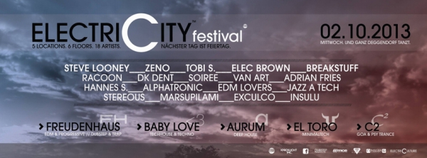 | ElectriCity Festival | Deggendorf | 02.10.13 | 18 Artists | 6 Floors | 5 Clubs ▼ FACTS: - Es ist das erste mal in Deggendorf. - Es ist ein Festival. - Am Mittwoch, 02.10.2013 ist es soweit. - Donnerstag ist Feiertag. ▀▀▀▀▀▀▀▀▀▀▀▀▀▀▀▀▀▀▀▀▀▀▀▀▀▀▀▀▀▀▀▀▀▀▀▀ ▼ WAS ES GEBEN WIRD: 5 Clubs. 6 Floors mit jeweils verschiedener Musikrichtung. 18 Artists verteilt über die ganze Stadt. Und das Beste: Einmal Eintritt bezahlen und Zugang zu allen Clubs. ▀▀▀▀▀▀▀▀▀▀▀▀▀▀▀▀▀▀▀▀▀▀▀▀▀▀▀▀▀▀▀▀▀▀▀▀ ▼ RAUS MIT DER SPRACHE: Der Ticketverkauf startet am 02.10.13 um 20.00 Uhr im Aurum Deggendorf. Dort gibt es, eine Stunde lang, bis 21.00 Uhr, das Early Bird Ticket Band für sensationelle 6.-€ Ab 21.00 Uhr gibt es an allen Locations für den normalen Eintritt von 8.-€ das Band das euch Zutritt zu allen Floors gewährt. ▀▀▀▀▀▀▀▀▀▀▀▀▀▀▀▀▀▀▀▀▀▀▀▀▀▀▀▀▀▀▀▀▀▀▀▀ ▼ FLOORS & SOUND: ★★★ Baby Love // Techhouse & Techno ★★★ Freudenhaus I // EDM & Progressive ★★★ Freudenhaus II // Dubstep & Trap ★★★ Aurum // Deep House ★★★ El Toro // Minimaltech ★★★ C2 // Goa & Psy Trance ▀▀▀▀▀▀▀▀▀▀▀▀▀▀▀▀▀▀▀▀▀▀▀▀▀▀▀▀▀▀▀▀▀▀▀▀ ▼▼▼ LINEUP & ARTISTS: ▀▀▀▀▀▀▀▀▀▀▀▀▀▀▀▀▀▀▀▀▀▀▀▀▀▀▀▀▀▀▀▀▀▀▀▀ ▼ BABY LOVE // ElectriCulture Floor: ★ Steve Looney (Electronic Motion, AT) ★ Zeno (Pressure Festival, AT) ★ Tobi S. (Still Cookin Rec., Ass&Clown, DE) ★ Elec Brown (Burnzzz Rec., Ass&Clown, P1 Muc, DE) ★ Jazz A Tech (Ass&Clown, DEG) ▀▀▀▀▀▀▀▀▀▀▀▀▀▀▀▀▀▀▀▀▀▀▀▀▀▀▀▀▀▀▀▀▀▀▀▀ ▼ FREUDENHAUS I // EDM & Progressive Floor: ★ Fort Knoxz (EDM Lovers, Onyx, SR) ★ Van Art (Diavents, theBank, PA) ★ Adrian Fries (Diavents, theBank, PA) ▀▀▀▀▀▀▀▀▀▀▀▀▀▀▀▀▀▀▀▀▀▀▀▀▀▀▀▀▀▀▀▀▀▀▀▀ ▼ FREUDENHAUS II // Dubstep & Trap Floor: ★ Breakstuff (Bassarea51, PAN) ★ Racoon (Bassarea51, PAN) ▀▀▀▀▀▀▀▀▀▀▀▀▀▀▀▀▀▀▀▀▀▀▀▀▀▀▀▀▀▀▀▀▀▀▀▀ ▼ AURUM // Deep House Floor: ★ Hannes S. (POA, Liquid Clubbing, AT) ★ Alphatronic (theBank, DEG) ▀▀▀▀▀▀▀▀▀▀▀▀▀▀▀▀▀▀▀▀▀▀▀▀▀▀▀▀▀▀▀▀▀▀▀▀ ▼ EL TORO // MinimalTech Floor: ★ DK Dent (Casa Electronica, DEG) ★ Soirée (Casa Electronica, DEG) ★ Stereous (Casa Electronica, DEG) ▀▀▀▀▀▀▀▀▀▀▀▀▀▀▀▀▀▀▀▀▀▀▀▀▀▀▀▀▀▀▀▀▀▀▀▀ ▼ C2 // Goa & Psytrance (Monkey Business Floor): ★ Marsupilami (Monkey Business, PA) ★ Exculco (Monkey Business, PA) ★ Insulu (Monkey Business, PA) ▀▀▀▀▀▀▀▀▀▀▀▀▀▀▀▀▀▀▀▀▀▀▀▀▀▀▀▀▀▀▀▀▀▀▀▀ More informations coming soon! Stay Electronic! ★ Ass&Clown ★ |