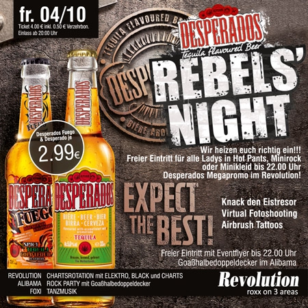 | Wir heizen euch richtig ein!!! Freier Eintritt für alle Ladys in Hot Pants, Minirock oder Minikleid bis 22.00 Uhr. Desperados Megapromo im Revolution! Knack den Eistresor, Virtual Fotoshooting und Airbrush Tattoos. Freier Eintritt mit Eventflyer bis 22.00 Uhr. Goaßhalbedoppeldecker im Alibama |
