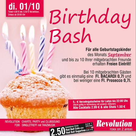 | Für alle Geburtstagskinder des Monats September und bis zu 10 Ihrer mitgebrachten Freunde erhalten Freien Eintritt! Bei 10 mitgebrachten Gästen gibt es einmalig eine Fl. BACARDI 0,7l und bei weniger eine Fl. Prosecco 0,7l. 5,- € Verzehrgutscheine für Ladys bis 22:00 Uhr. (Nicht gültig in Verbindung mit anderen Aktionen). Alle Cocktails 2.99 € & alle Shots 1.50 €. |
