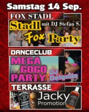 | Mega GoGo Party - Danceclub Mega GoGo Party by DJ Delgado Fox Stadl - Stadl Fox Party mit DJ Stefan S. Terrasse - Jacky Promotion Einlass ab 18 Jahren. Eintritt 5,- €. Geöffnet jeden Freitag und Samstag sowie vor Feiertagen ab 21:00 Uhr. |