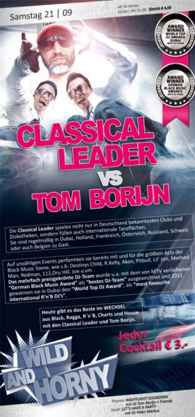 | Classical Leader vs Tom Borijn Die Classical Leader spielen nicht nur in Deutschland bekanntesten Clubs und Discotheken, sondern fühlen auch internationale Tanzflächen. Sie sind regelmäßig in Dubai, Holland, Frankreich, Österreich, Russland, Schweiz oder auch in Belgien zu Gast! Auf unzähligen Events performten sie bereits mit und für die größten Acts der Black Musik Szene, wie z.b. Destinys Child, R. Kelly, Akon, Pitbull, Lil`Jon, Methond Man, Redman, 112, Dru Hill, Joe uvm..... Das mehrfach preisgekrönte DJ-Team wurde u.a. mit dem von MTV verliehenen "GERMAN BLACK MUSIC AWARD" als "BESTES DJ_TEAM" ausgezeichnet und 2011 gewannen sie in Dubai den "WORLD TOP DJ AWARD" als "MOST FAVOURITE INTERNATIONAL R`n`B DJs! Heute gibt es das Beste im WECHSEL aus Black, Ragga, R`n`B, Charts und House mit den Classical Leader und Tom Borijn. Jeder Cocktail € 3.- ...dazu wie jeden Samstag... Wild und Hemmungslos Feiern@Nl Boot 0,5l Absolut + 3 RedBull € 22,00 Boot 1,0l Absolut + 6 RedBull € 38,00 Pharao : Nightlight Soundmix mit DJ TOM BORIJN & Friends Stadl : Lets have a Party mit DJ Peter Markus ab 16 Jahren | Einlass Uhr 21:00 | Eintritt € 4,00 Aufsichtspflichtformular : http://documents.nightlight-innernzell.de/documents/NL_Aufsichtspflicht_Formular.pdf |