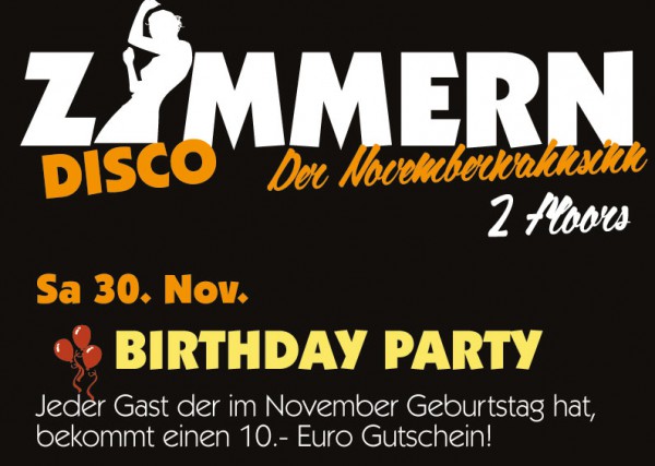 | Birthday Party @ Disco Zimmern - Mainarea & Jukebox Jeder Gast der im November Geburtstag hat, bekommt einen 10,- Euro Gutschein !!! Mainarea: Best Of House & Charts - wir feiern die beste Party! Jukebox: Gute-Laune-Mix (ClassicRock, Fetenhits & Partysound) Doors: 21.00 Uhr Einlass ab 16 Jahren! U18 mit Erziehungsbeauftragung - Ausweiskontrolle! |