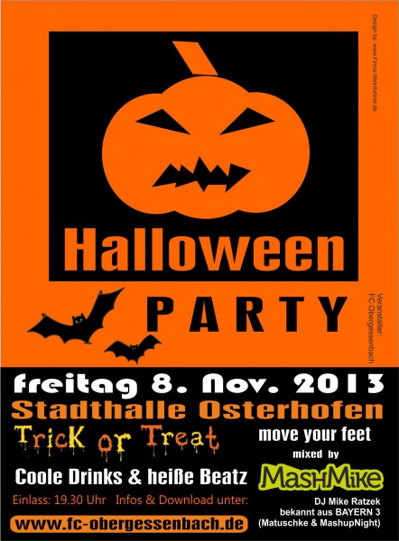 | Halloween-Party Trick or treat - move your feet!!! Coole Drinks und heiße Beatz. Osterhofen. Am Fr. 8. November veranstaltet der FC Obergessenbach die 3. Halloweenparty in der Stadthalle Osterhofen. Der bekannte Soundtüftler DJ MashMike wird das Partyvolk in gewohnter Manier wieder zum Tanzen bringen. Einlass ist um 19.30 Uhr für alle Partygänger ab 16 Jahren. Für Jugendliche, die noch nicht 18 Jahre sind, gibt es eine Erziehungsbeauftragung auf der FC-Homepage www.fc-obergessenbach.de zum herunterladen (siehe Link unten!). Wichtig: nur diese Beauftragung ist bei der Veranstaltung gültig. Die Fußballerinnen und Fußballer des FC freuen sich auf viele Besucher. Hier geht's zur FCO Homepage! |