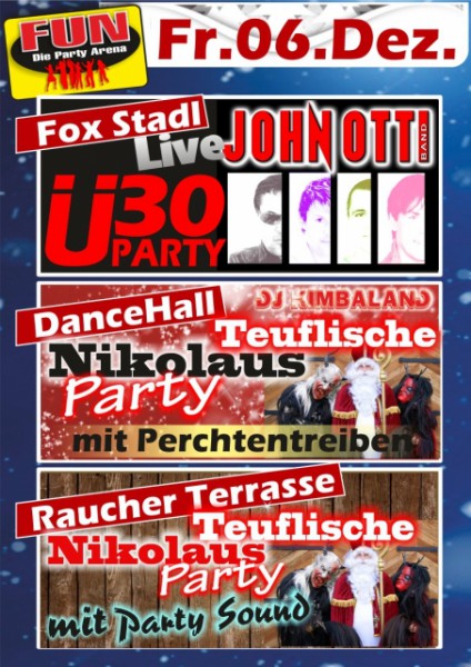 | Ü30 mit John Otti Band live - Fox Stadl DJ Kimbaland - DanceHall Teuflische Nikolaus Party mit Party Sound - Raucher Terrasse Eintritt 5,- €. Geöffnet jeden Freitag und Samstag sowie vor Feiertagen ab 21:00 Uhr |
