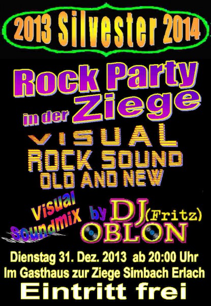 | Silvester Rock Party in der Ziege Visual Rock Sound old and new Visual Soundmix mit DJ (VJ) Fritz OBLON Eintritt frei |