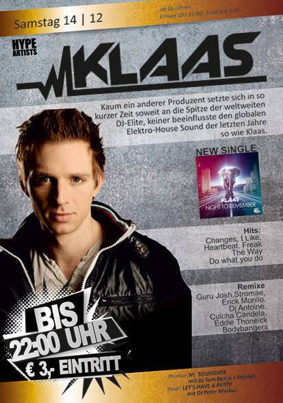 | Endlich am Start für Euch!! "Klaas"... DJ-Set Kaum ein anderer Produzent setzte sich in so kurzer Zeit soweit an die Spitze der weltweiten DJ-Elite, keiner beeinflusste den globalen Elektro-House Sound der letzten Jahre so wie Klaas !! New Single : Night to Remember Hits : - Changes - I Like - Heartbeat - Freak - The Way - Do what you do Remixe : Guru Josh , Stromae , Erick Morillo , Eddie Thoneick , Dj Antoine , Bodybangers ..... ...dazu wie jeden Samstag... Wild und Hemmungslos Feiern@Nl Boot 0,5l Absolut + 3 RedBull € 22,00 Boot 1,0l Absolut + 6 RedBull € 38,00 Pharao : Nightlight Soundmix mit DJ TOM BORIJN & Friends Stadl : Lets have a Party mit DJ Peter Markus ab 16 Jahren | Einlass Uhr 21:00 | Eintritt € 5,00 >>> BIS 22:00 Uhr >>> Eintritt nur € 3,00 Aufsichtspflichtformular : http://documents.nightlight-innernzell.de/documents/NL_Aufsichtspflicht_Formular.pdf |