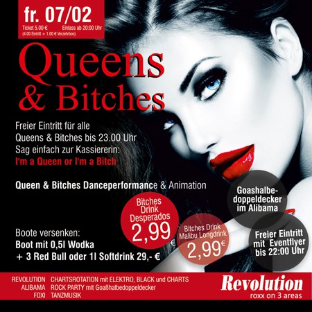 | Freier Eintritt für alle Queens & Bitches bis 23.00 Uhr. Sag einfach zur Kassiererin: I'm a Queen or I'm a Bitch! Queen & Bitches Danceperformance & Animation. Bitches Drink Desperados 2,99 €. Bitches Drink Malibu Longdrink 2,99 €. Goashalbedoppeldecker im Alibama. Freier Eintritt mit Eventflyer bis 22:00 Uhr. Boote versenken: Boot mit 0,5l Wodka + 3 Red Bull oder 1l Softdrink 29,- € |