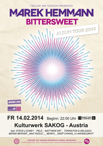 | MAREK HEMMANN xx "Bittersweet" Album Tour EINZIGER SALZBURG / OÖ AUFTRITT 2014 !!! Featuring: STEVE LOONEY´s B_DAY CLASH !!! FREITAG 14.02.2014 <> Kulturwerk SAKOG KESSEL MAREK HEMMANN "Bittersweet" Album Tour _ Freude am Tanzen _ DE www.marekhemmann.com www.facebook.com/marekhemmann.music PELÈ www.facebook.com/pelemusic MATTHEW ART www.facebook.com/Matthew.Art.Page1 BENKO www.facebook.com/Benko.Official AUGEN AUF >> VL MANDELBROT _ AT www.facebook.com/mandelbrotmedia STEVE LOONEY´s B_DAY HELL STEVE LOONEY (happy birthday digga !!!) special 3 hours ride !!! www.facebook.com/stevelooney.at TOWNSTON & DELGADO www.facebook.com/townstonanddelgado BERND BERGER www.facebook.com/bernd.berger.5 MAX HIZZLE www.facebook.com/maxhizzleofficial DEEP CHAINS www.facebook.com/deepchains SPECIAL LOONEY ROOM DESIGN !!!!! VVK: 14€ zzgl. Geb. // RAIKA CLUB: 13€ VVK STELLEN: Ö-Ticket & allen Raika Filialen Österreichweit !!! Sowie: Libro, Saturn, Mediamarkt, Maximarkt, uvm.!!! ONLINE VVK & VIP TICKETS @ http://electronic-motion.com/web/index.php?option=com_content&view=category&layout=blog&id=49&Itemid=41&lang=de GEBÜHRENFREIE VVK TICKETS @ (ab 01.02.) SNEAKZ! Store im Europark HANDYBÖRSE Kieselcenter & Linzergasse 55 GEBÜHRENFREIE VIP TICKETS PN AN: E-Motion Bianca oder Mail an: bianca@electronic-motion.com Einlass ab 16 Jahren mit Lichtbildausweis! presented by: www.electronic-motion.com www.facebook.com/electronicmotion1 www.sakog.net |