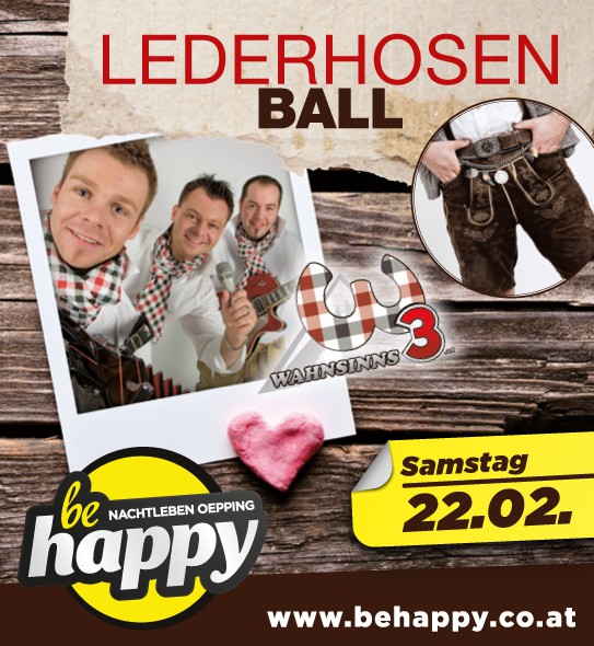| Der Ball der Bälle im be happy Öpping! Seit mehr als 10 Jahren ein Klassiker im Ball-Kalender! Jeder Gast in Lederhose oder Dirndl erhält bis 23 Uhr ein Begrüßungsgetränk! Live im be happy Stadl: DIE WAHNSINNS 3 - Teilnehmer der aktuellen Puls 4 Castingshow "Herz von Österreich". Partystimmung pur mit den 3 Stimmungskanonen aus dem Mühlviertel! |