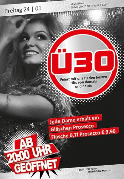 | Ü-30 Deluxe Feiert mit uns zu den besten Hits von damals und heute! Jede Dame erhält ein Gläschen Prosecco Flasche 0,7l Prosecco € 9,90 Stadl : Ü-30 Sound mit DJ Peter Markus ab 18 Jahren | Einlass Uhr 20:00 | Eintritt € 3,00 |