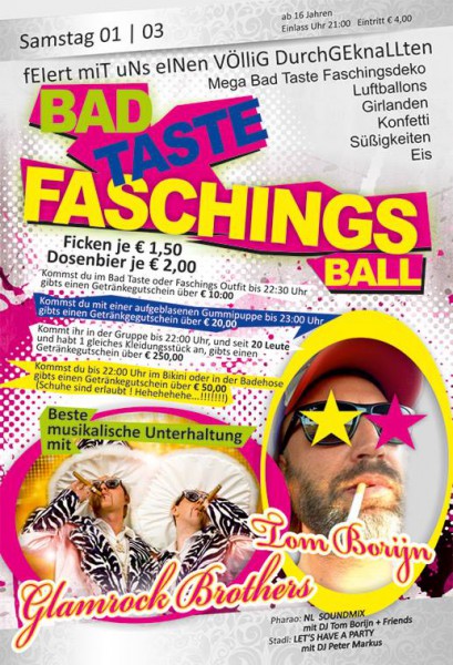 | Bad Taste Faschingsball Feiert mit uns einen völlig durchgeknallten Faschingssamstag! Mega Bad Taste Faschingsdeko Luftballons Girlanden Konfetti Süßigkeiten Eis > Ficken je € 1,50 > Dosenbier je € 2,00 >> Kommst du im Bad Taste oder Faschings Outfit bis 22:30 Uhr gibts einen Getränkegutschein über € 10:00 >> Kommst du mit einer aufgeblasenen Gummipuppe bis 23:00 Uhr gibts einen Getränkegutschein über € 20:00 >> Kommt ihr in der Gruppe bis 22:00 Uhr, und seit 20 Leute und habt 1 gleiches Kleidungsstück an, gibts einen Getränkegutschein über € 250:00 >> Kommst du bis 22:00 Uhr im Bkini oder in der Badehose gibts einen Getränkegutschein über € 50:00 ( Schuhe sind erlaubt!! Hehehehehehe...) Beste musikalische Unterhaltung mit den Glamrock Brothers & DJ Tom Borijn ...dazu wie jeden Samstag... Wild und Hemmungslos Feiern@Nl Boot 0,5l Absolut + 3 RedBull € 22,00 Boot 1,0l Absolut + 6 RedBull € 38,00 Pharao : Nightlight Soundmix mit DJ TOM BORIJN & Friends Stadl : Lets have a Party mit DJ Peter Markus ab 16 Jahren | Einlass Uhr 21:00 | Eintritt € 4,00 |