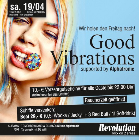 | Wir holen den Freitag nach! Supported by Alphatronic 10,- € Verzehrgutscheine für alle Gäste bis 22.00 Uhr (beim bezahlen des Eintritts) Raucherzelt geöffnet! Schiffe versenken: Boot 29,- € (0,5l Wodka / Jacky + 3 Red Bull / 1l Softdrink). |