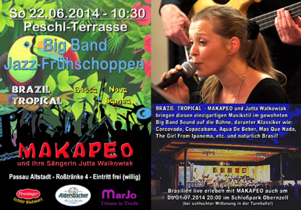 | BRAZIL TROPICAL MAKAPEO und ihre Sängering Jutta Walkowiak bringen diesen einzigartigen Musikstil im gewohnten Big Band Sound auf die Bühne. Darunter so weltbekannte Klassiker wie: Corcovado, Copacabana, The Girl From Ipanema, Aqua De Beber, Mas Que Nada und natürlich Brasil! |