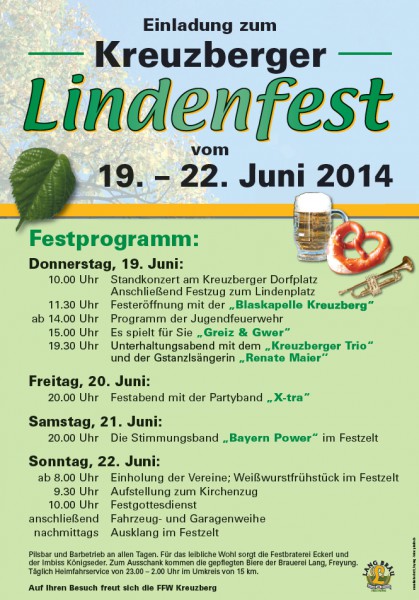 | Festprogramm: Donnerstag, 19. Juni: 10.00 Uhr: Standkonzert am Kreuzberger Dorfplatz Anschließend Festzug zum Lindenplatz 11.30 Uhr: Festeröffnung mit der „Blaskapelle Kreuzberg“ ab 14.00 Uhr: Programm der Jugendfeuerwehr 15.00 Uhr: Es spielt für Sie „Greiz & Gwer“ 19.30 Uhr: Unterhaltungsabend mit dem „Kreuzberger Trio“ und der Gstanzlsängerin „Renate Maier“ Freitag, 20. Juni: 20.00 Uhr: Festabend mit der Partyband „X-tra“ Samstag, 21. Juni: 20.00 Uhr: Die Stimmungsband „Bayern Power“ im Festzelt Sonntag, 22. Juni: ab 8.00 Uhr: Einholung der Vereine; Weißwurstfrühstück im Festzelt 9.30 Uhr: Aufstellung zum Kirchenzug 10.00 Uhr: Festgottesdienstanschließend Fahrzeug- und Garagenweihe nachmittags Ausklang im Festzelt Pilsbar, Weinbar und Barbetrieb an allen Tagen. Für das leibliche Wohl sorgt die Festbraterei Eckerl und der Imbiss Königseder. Zum Ausschank kommen die gepflegten Biere der Brauerei Lang, Freyung. Täglich Heimfahr service von 23.00 – 2.00 Uhr im Umkreis von 15 km. Auf Ihren Besuch freut sich die FFW Kreuzberg |