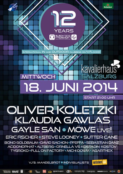 | Eristoff Tracks & Heineken presentz: ---------------------------------------------------------------------- +12 YEARS OF ELECTRONIC MOTION ★ + KAVALIERHAUS ★★ Salzburg / Klessheim (AT) + MITTWOCH 18.06.2014 <> Doors Open: 21cet International IN AND OUTdoor Clubbing on 4 Floors! ----------------------------------------------- + FRONTAGE 3D ANIMATIONS BY: INDIVISUALISTS (DE) //www.facebook.com/indivisualists ----------------------------------------------- + MARMOR SAAL★ ..."mitten ins herz!" ▬▬▬▬▬▬▬▬▬ ++ OLIVER KOLETZKI www.facebook.com/OliverKoletzki ++ MÖWE live! www.facebook.com/moewemusic ++ ERIC FISCHER www.danube-rave.at ++ BONO GOLDBAUM www.facebook.com/goldbaum.bono ++ DAVID SACHON www.facebook.com/david.sachon + ROOM ATMOSPHERE CREATIONS by lady_b + + NEW SOUND & STAGE DESIGN CONCEPT + --------------------------------------------- + OUTDOOR TECHNO CIRCUS + (neu im zirkuszelt!) ..."nur die harten kommen in den garten!" ------------------------------------------------------------------------ ++ KLAUDIA GAWLAS www.facebook.com/KlaudiaGawlasMusic ++ GAYLE SAN /www.facebook.com/gaylesanofficial ++ SUTTER CANE www.facebook.com/suttercaneofficial ++ STEVE LOONEY www.facebook.com/stevelooney.at ++ PFEFFA www.facebook.com/stefan.pfeffayounity + VISUAL DESIGN by mandelbrot + www.facebook.com/mandelbrotmedia NEW AREA !!! + GOA & PSYTRANCE KITCHEN + Hosted by: Noize Infection www.facebook.com/NoizeInfection -------------------------------------------------------------------- ++ ACIDONOPHAT www.facebook.com/acidonophat ++ TYGROKO (Hi-Tech Syndicate) ++ FULL ON FACTORY (Psy Factory) ++ AGARTHEX (Psygäu) +++ DEKO BY COSMIC LIGHT TEAM + + SCHICHT IM SCHACHT PAGODE + (outdoor!) Hosted by: Kulturwerk SAKOG www.facebook.com/sakognet ▬▬▬▬▬▬▬▬▬▬▬▬▬▬▬ ++ SEBSTIAN DANZ www.facebook.com/SebastianDanz ++ ALTBERG www.facebook.com/getdrowned ++ ORNELLA vs. KOSTADIN KOSTOV www.facebook.com/kriminelly.ornella www.facebook.com/kostadin.kostov.503 ++ MICHI DOWM www.facebook.com/threesix.nine.5 DIA ROOM PRODUCTIONS BY ★ Mandelbrot ★ --------------------------------------------------------- ## VVK TICKET > 16€ Raika Clubmitglieder SBG (!) > 15€ ##VIP TICKET > 38€ Raika Clubmitglieder SBG (!) > 37€ ##VIP TICKET - GEBÜHRENFREI und TISCH RESERVIERUNGEN an: bianca@electronic-motion.com ##ABENDKASSE AB 21 UHR GEÖFFNET !!! ##Einlass ab 16 Jahren mit Lichtbildausweis! -------------------------------------------------------------------------------------------------------- ##VVK & VIP STELLEN: (zzgl. gebühren!) - Bei allen Ö-Ticket & RAIKA Filialen Ö-Weit !!! - Sowie im: Libro, Saturn, Mediamarkt, Maximarkt, Sparkassen uvm.! - ONLINE VVK & VIP TICKETS zum selber drucken @ www.electronic-motion.com ## VVK STELLEN: (gebührenfrei!) - SNEAKZ! im Europark // Ab 15.05. - 4SEASONS Salzburg // Ab 15.05. - HANDYBÖRSE Kiesel & Linzergasse 55 // Ab 15.05. ## OFFICIAL AFTERSHOW@ Felsenkeller www.felsenkeller-salzburg.at ##CITY SHUTTLE SERVICE by Albus Stops: Kavalierhaus - Aftershow ##VIP/INFO/PRESSE: bianca@electronic-motion.com ##HQ PHOTOS BY: www.aw-photos.de www.whyt.org ##WEB CHECK: www.electronic-motion.com www.kavalierhaus.at short press: !!! 12 YEARS WITHOUT FEARS !!! --------------------------------------------------------- Könnte man getrost von sich geben. "Augen zu und durch, Hauptsache geil wirds für alle...", war immer schon der Leitspruch von der bunt gemischten Freak Fraktion "Electronic Motion". Damals ein Verein - heute eine Firma die tolle Mitarbeiter beschäftigt. Wir sind allerdings nicht ganz "d´accor" welche Phase unseres Daseins Stressloser war 12 Jahre in dieser knallharten Branche sind schon was wert - trauen wir uns HEUTE zu behaupten! Oh Ja - Das muss uns erst Mal wer nach machen. Und wir hoffen es kommt überhaupt was nach im Promoter Sektor! Dennoch haben wir viel erlebt in diesen Jahren, viel gutes - viel schlechtes, wir haben unendlich viel gelacht und brutal gut gefeiert, die Stirn gerunzelt und schier aussichtlose Probleme behoben... ein ewiges Auf & Abfahren mit der Party Achterbahn in unserem eigens, kreierten Techno Vergnügungspark! ABER - GENUG MIT DER WEHMUT: Wir sind noch immer am Start und das wollen wir MIT EUCH ALLEN gebühren in Grund und Boden feiern - denn dank EUCH haben wir uns IMMER und IMMER WIEDER aufgerafft weiter zu spinnen! DAS MUSS BELOHNT WERDEN: MORE THEN 20 ACTS - INTERNATIONAL als auch NATIONAL - auf 4 verschiedenen FLOORS - in einer Location die sich mit SICHERHEIT "UNIQUE" betiteln darf. Dem sensationellen KAVALIERHAUS SALZBURG. |