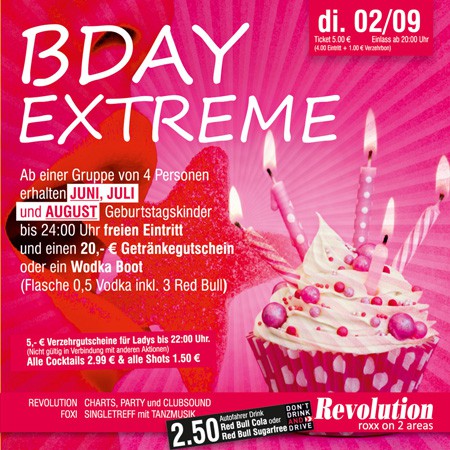 | BDAY EXTREME Ab einer Gruppe von 4 Personen erhalten JUNI, JULI und AUGUST Geburtstagskinder bis 24:00 Uhr freien Eintritt und einen 20,- € Getränkegutschein oder ein Wodka Boot (Flasche 0,5 Vodka inkl. 3 Red Bull) |