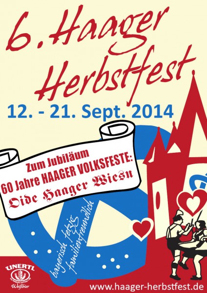 | Freitag, 12.09.2014 17.00 Uhr Standkonzert vor der Brauerei Unertl anschließend Jubiläums-Einzug durch Haag mit allen am Herbstfest beteiligten Blaskapellen 18.00 Uhr Wiesn Eröffnung mit den Haager Böllerschützen Samstag, 13.09.2014 11.30 Uhr Wiesnbetrieb mit vergügungspark 17.00 Uhr NAchtflohmarkt des BRK 19.00 Uhr Wiesn Stimmung Sonntag, 14.09.2014 09.30 Uhr Kircheneinzug vom Festplatz zum Marktplatz 10.00 Uhr Erntedankgottesdienst am Marktplatz, bei schlechter Witterung in der Kirche 11.00 Uhr Rückzug zum Festplatz 11.30 Uhr Wiesnbetrieb mit Vergügungspark Tag der Nachbarschaft Montag, 15.09.2014 11.30 Uhr Wiesnbetrieb mit Vergnügungspark - Seniorennachmittag, Tag der Feuerwehren und Musikantenstammtisch Dienstag, 16.09.2014 11.30 Uhr Wiesnbetrieb mit Vergnügungspark - Tag der Vereine ab 18.00 Uhr Ladys-Night: Damen fahren zum halben Preis Mittwoch, 17.09.2014 11.30 Uhr Wiesnbetrieb mit Vergnügungspark 14.00 bis 20.00 Uhr Kindertag mit ermäßigten Fahrpreisen, Spiele und Überraschungen für die Kleinen - Ausweichtermin bei Regen Freitag, 19.09.2014 Donnerstag, 18.09.2014 11.30 Uhr Wiesnbetrieb mit Vergnügungspark - Nacht der Tracht Freitag, 19.09.2014 11.30 Uhr Wiesnbetrieb mit Vergnügungspark Samstag, 20.09.2014 11.30 Uhr Wiesnbetrieb mit Vergnügungspark Sonntag, 21.09.2014 11.30 Uhr Oldtimer Treffen Festausklang |