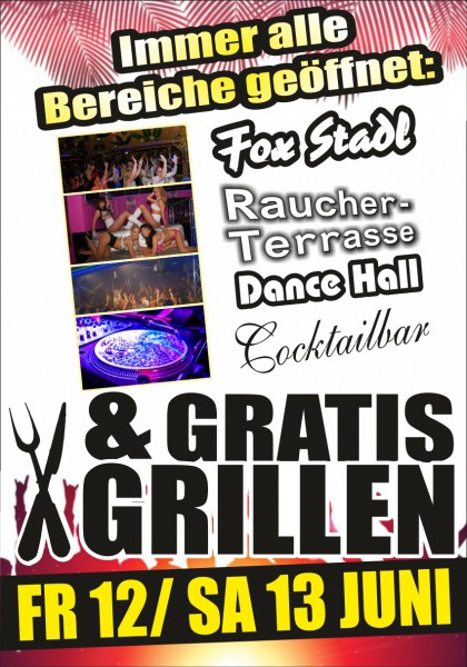 | Lassen wir die SAU raus ...im FUN - Die Partyarena Gratis Grillen....von Juni bis August Feiern auf 4 Areas: - Stadl - Dancehall - Cocktailbar - Raucherterrasse Geöffnet immer Freitags und Samstags sowie vor Feiertagen ab 21 Uhr. Eintritt 5€. Infos unter http://www.fun-partyarena.de |
