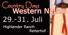 | Country Fest auf der Highlander Ranch! 3 Tage Power mit Country - Rock - Bands > Donnerstag ab 19.00 Uhr: Country & Rock mit \"Alabama\" > Freitag ab 20.00 Uhr: Country & Rock mit \"The Second Hand Boys\" > Samstag ab 20.00 Uhr: Country & Rock mit \"Cold Shot\" Camping möglich, zusätzlich Tipis zu vermieten unter Tel. 0170/8943093. Samstag ab 16.00 Uhr und Sonntag ab 10.00 Uhr großes Pferderennen. Übers ganze Festival verschiedene Bars und Verkaufsstände auf dem Gelände. |