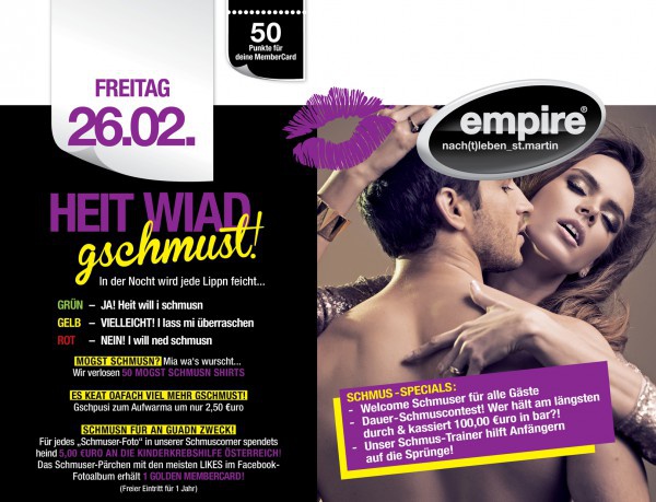 | In der Nocht wird jede Lippe feucht.... +Mogst Schmusn? Mia wa‘s wurscht... Wir verlosen 50 Mogst schmusn Shirts + Es keat oafach viel mehr gschmust : Gschpusi zum Aufwarma um 2,50 €uro + Schmusn für an guadn zweck: Für jedn Schmuser an unserm SCHMUSCORNER spendets heind 5,00 €uro an die Kinderkrebshilfe Österreich! Das Schmuser-Pärchen mit den meisten LIKES im Facebook-Fotoalbum erhält 1 Goldene Membercard!!! GRÜN – JA! Heit will i schmusn GELB – VIELLEICHT! I lass mi überraschen ROT – NEIN ! I will ned schmusn SCHMUS – SPECIALS: - Welcome Schmuser für alle Gäste - Dauer – Schmuscontest! Wer hält am längsten durch & kassiert 100 €URO in bar?! - Unser Schmus-Trainer hilft Anfängern auf die Sprünge! ___________________________________________________ Cola Rum bis 23.00 Uhr um 1,00 €uro, danach kostet‘s 2,00 €uro + Eristoff Blood Orange 0,7 lt. + 1 lt. O-Saft um 50,00 €uro + Bacardi 0,35 lt. + 0,5 lt. Cola um nur 24,00 €uro SCHILLING ALARM (FR & SA) |