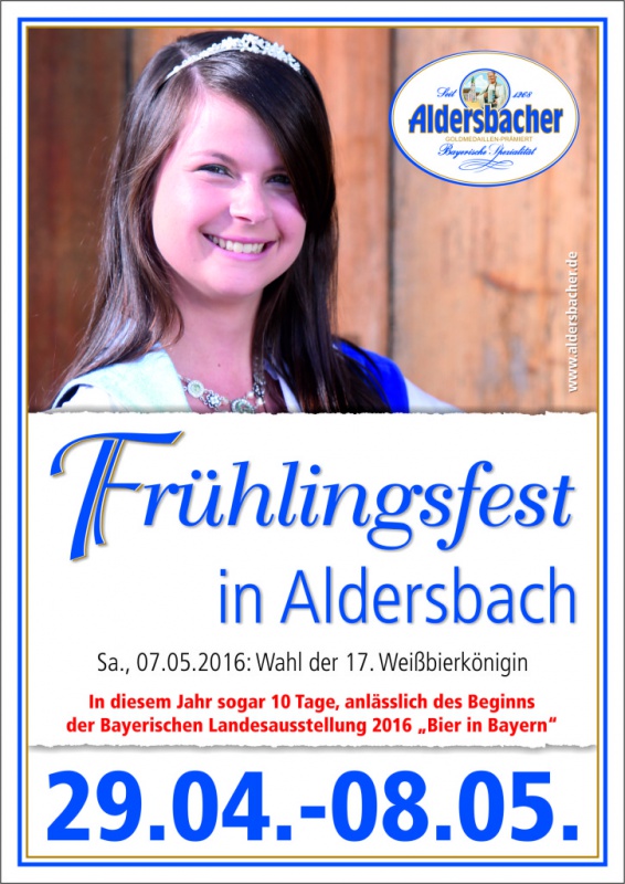 | Programm 29.04.2016: Beginn des Aldersbacher Frühlingsfestes mit Festzug und musikalischer Umrahmung durch die Bartholomäus Bläser, die Inntaler Buam und DJ Pete Rush & DJ ChrisMoe. 30.04.2016: Musik von Krach & Fürchterlich, Schmidt & Eder und den Bayernrockern. 01.05.2016: Musik von Krach & Fürchterlich und der Feuerwehrkapelle Unterzeitlarn. 02.05.2016: Tag der Behörden und Kommunalpolitik mit Musik von den Wolfachtaler Musikanten. 03.05.2016: Familien- und Seniorennachmittag mit Musik von der Biertisch Musi. 04.05.2016: Tag der Jugend mit X-TRA und der Biertisch Musi. 05.05.2016: Musik von Hot Sugar. 06.05.2016: Musik von den Bamhagge Buam und DJ Pete Rush & DJ ChrisMoe. 07.05.2016: Wahl der Aldersbacher Weißbierkönigin mit Musik von den neuen Münchsdorfern und den Black Eagles. 08.05.2016: Letzter Tag des Aldersbacher Frühlingsfestes mit Musik von den Weinzierer Dorfmusikanten. |