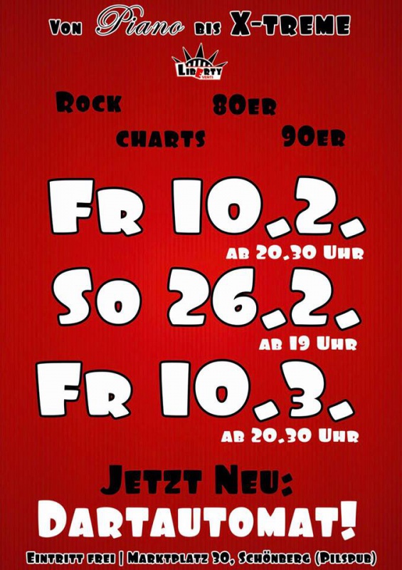 | Rock, Charts, 80er und 90er den ganzen Abend! JETZT neu bei uns: Dartautomat! Wir freuen uns auf euer kommen! |