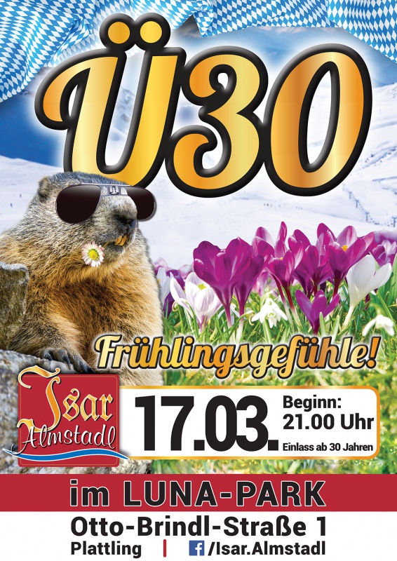 | Es is wieder Zeit für FRÜHLINGSGEFÜHLE! Uns reichts mit dem koidn Depriwetter und desweng leit ma etz an Frühling ei! Da DJ Goldberg bringt die Gefühle in Fahrt, gfreits eich auf a Nacht mit "vui Gfui" Obacht, es gibt wieder wos zum gwinna! Unter allen de der Veranstaltung bei Facebook (https://www.facebook.com/events/418739048465299/) zuasong verlosma am Freitag den 17.03.: - 3x 5er Hopfen Bussi - 3x Flasche Prosecco - 3x Flasche Wein (Gewinn kann bloß am Freitag 17.03. eiglöst wern!) Für de Hungrigen unter eich steht vorm Stadl unser Wiaschtl-Imperium. Do gibt's z. B. frische, knusprige Pommes und dazua a Currywurscht! Eure Isar-Almstadl-Crew (Einlass ab 30 Jahren) |