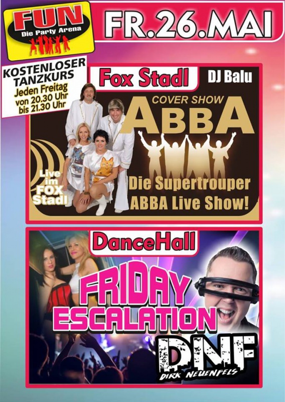 | Supertrouper ABBA Live Show mit einer ABBA Cover Band und DJ Balu im Fox Stadl. Außerdem Kostenloser Tanzkurs. In der Dance Hall große Friday Escalation mit Dirk Neuenfels. Feiern auf 4 Areas: - Stadl - Dancehall - Cocktailbar - Raucherterrasse Geöffnet immer Freitags und Samstags sowie vor Feiertagen ab 21 Uhr. Infos unter www.fun-partyarena.de |
